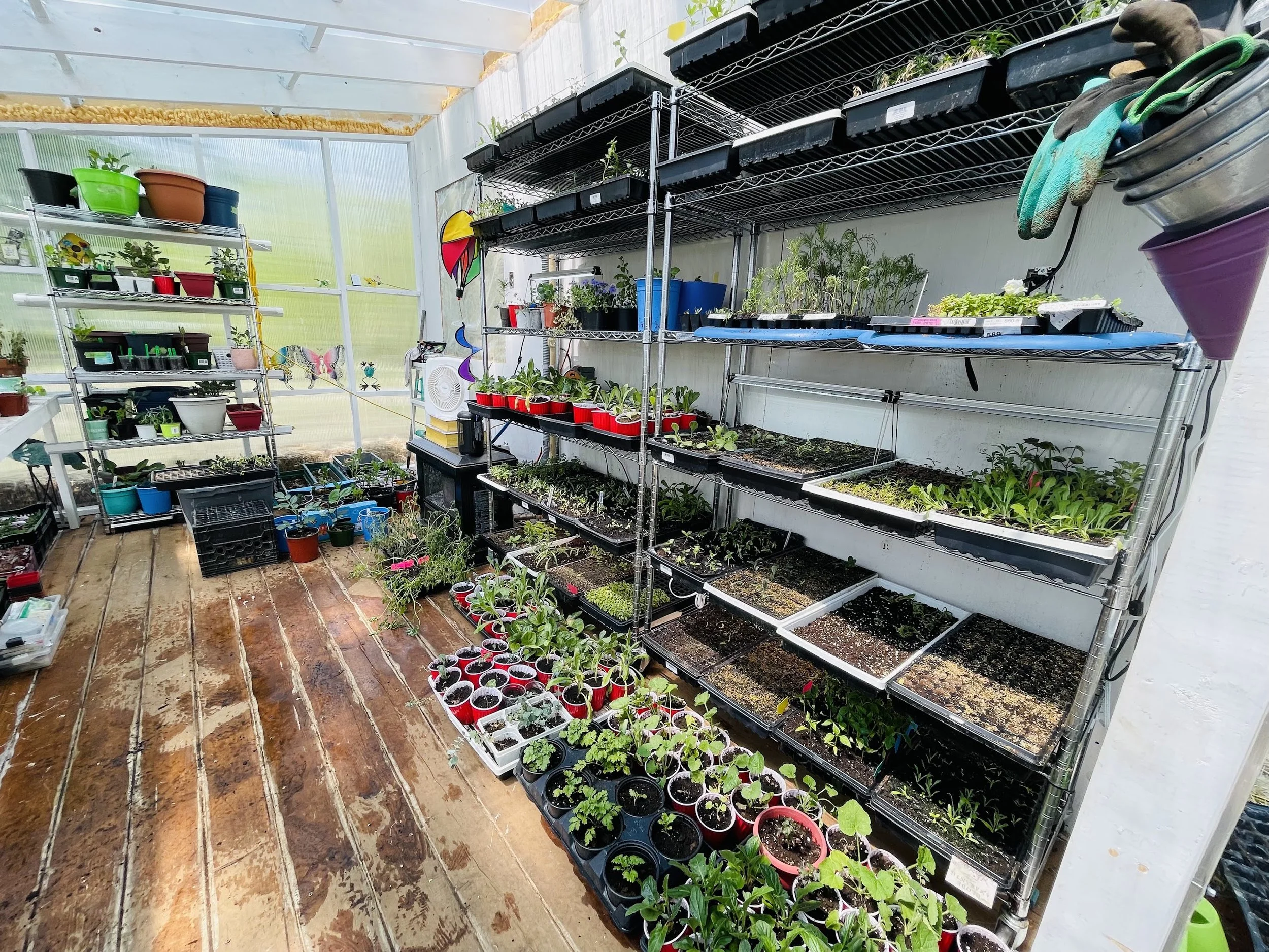 I now have 4 sets of shelves, an entire bench in the greenhouse and the floor and run out of space. In 2024 we will be adding a polytunnel to the farm to help extend the season in the spring and fall.
